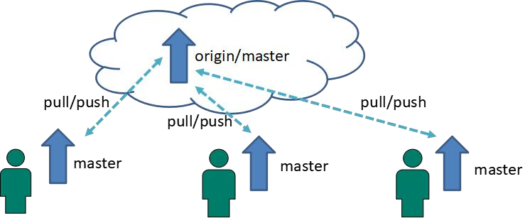 像 SVN 一样,集中式工作流以中央仓库作为项目所有修改的单点实体。所有修改都提交到 Master 这个分支上。这种方式与 SVN 的主要区别就是开发人员有本地库。Git 很多特性并没有用到。这样就是当人多了就会很容易冲突;
