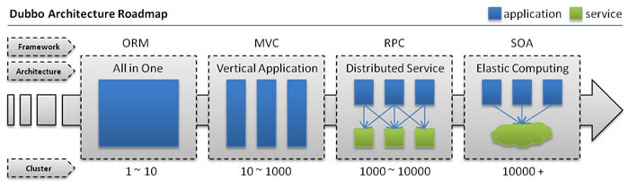 当垂直应用越来越多,应用之间交互不可避免,将核心业务抽取出来,作为独立的服务,逐渐形成稳定的服务中心,使前端应用能更快速的响应多变的市场需求。此时,用于提高业务复用及整合的分布式服务框架(RPC)是关键。