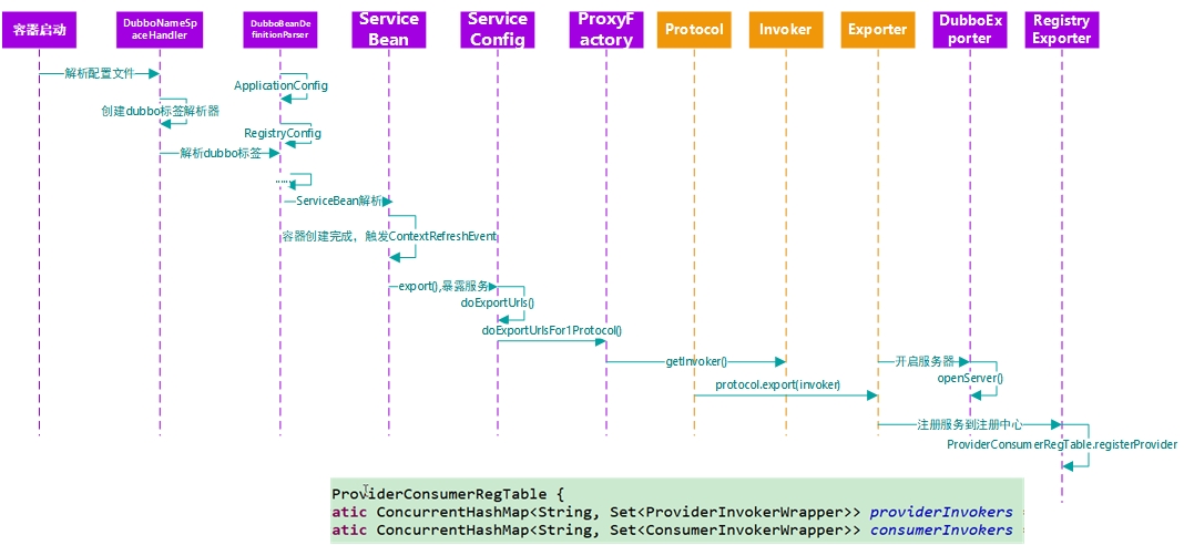 构造时调用DubboNamespaceDuplicate进行初始化,然后将配置文件中的value注入到想用的Config.class或Bean.class文件中,解析Service标签会将其封装成serviceBean,其中还包含将服务暴露到注册中心的过程。