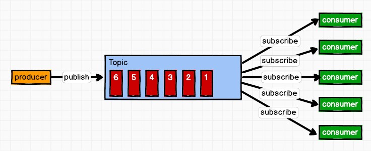 消息生产者(发布)将消息发布到 topic 中,同时有多个消息消费者(订阅)消费该消息。和点对点方式不同,发布到 topic 的消息会被所有订阅者消费。