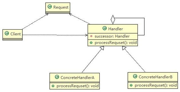 - ConcreteHandlerA , B 是具体的处理者, 处理它自己负责的请求,可以访问它的后继者(即下一个处理者),如果可以处理当前请求,则处理,否则就将该请求交个后继者去处理,从而形成一个职责链