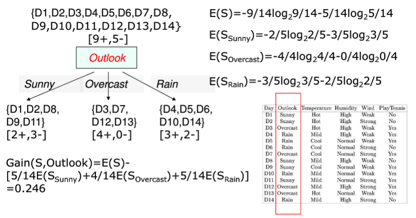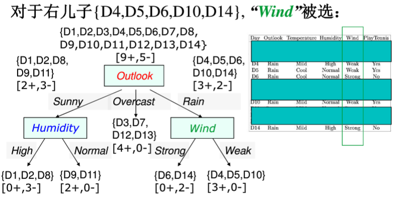计算各信息增益,最大的是OutLook,根据OutLook划分