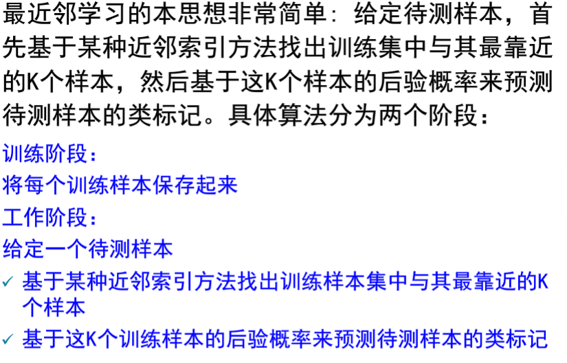 消极学习(lazy learning):没有显式训练过程,训练阶段只是把训练样本保存起来,建模工作