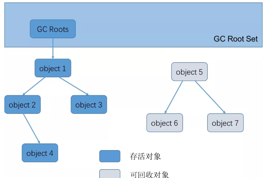 当一个对象到 GC Roots 没有任何引用链相连(GCRoots 到这个对象不可达)时,就说明此对象是不可用的,是死对象。如下图:object1、object2、object3、object4 和 GC Roots 之间有可达路径,这些对象不会被回收,但 object5、object6、object7 到 GC Roots 之间没有可达路径,这些对象就被判了死刑。