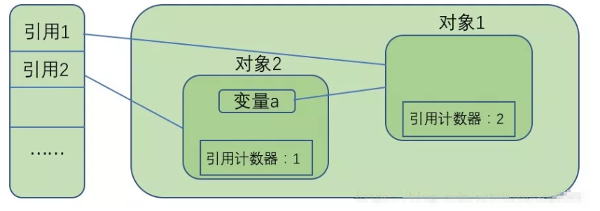 给每一个对象添加一个引用计数器,每当有一个地方引用它时,计数器值加 1;每当有一个地方不再引用它时,计数器值减 1,这样只要计数器的值不为 0,就说明还有地方引用它,它就不是无用的对象。如下图,对象 2 有 1 个引用,它的引用计数器值为 1,对象 1 有两个地方引用,它的引用计数器值为 2。