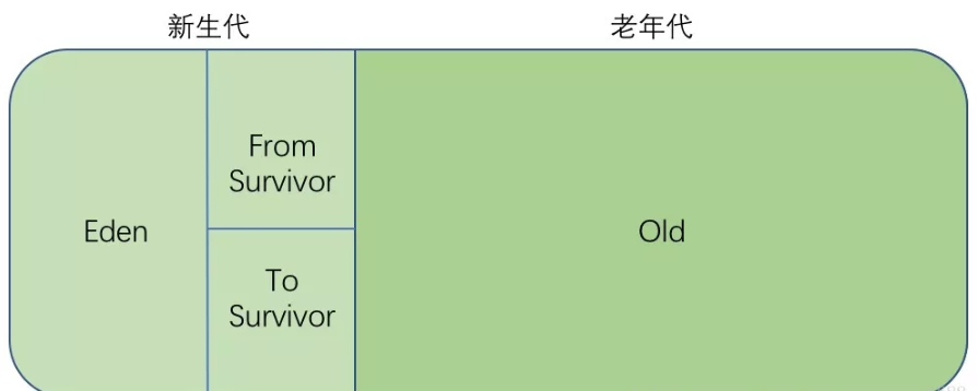 新生代中的对象 98%都是“朝生夕死”的,所以并不需要按照 1:1 的比例来划分内存空间,而是将内存分为一块比较大的 Eden 空间和两块较小的 Survivor 空间,