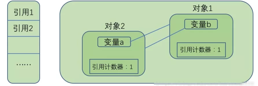这种方法看起来非常简单,但目前许多主流的虚拟机都没有选用这种算法来管理内存,原因就是当某些对象之间互相引用时,无法判断出这些对象是否已死,如下图,对象 1 和对象 2 都没有被堆外的变量引用,而是被对方互相引用,这时他们虽然没有用处了,但是引用计数器的值仍然是 1,无法判断他们是死对象,垃圾回收器也就无法回收。