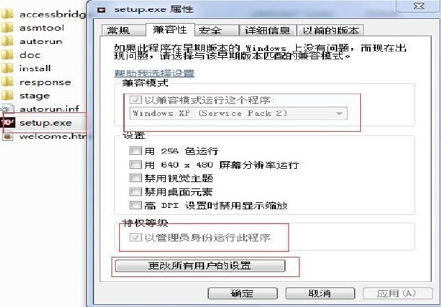 1.解压。oracle数据库安装包,如果是win7或者win8系统右键点击setupexe选择兼容性,以XP方式,并且以管理员方式运行,以及其他所有用户都按着此规则如图
